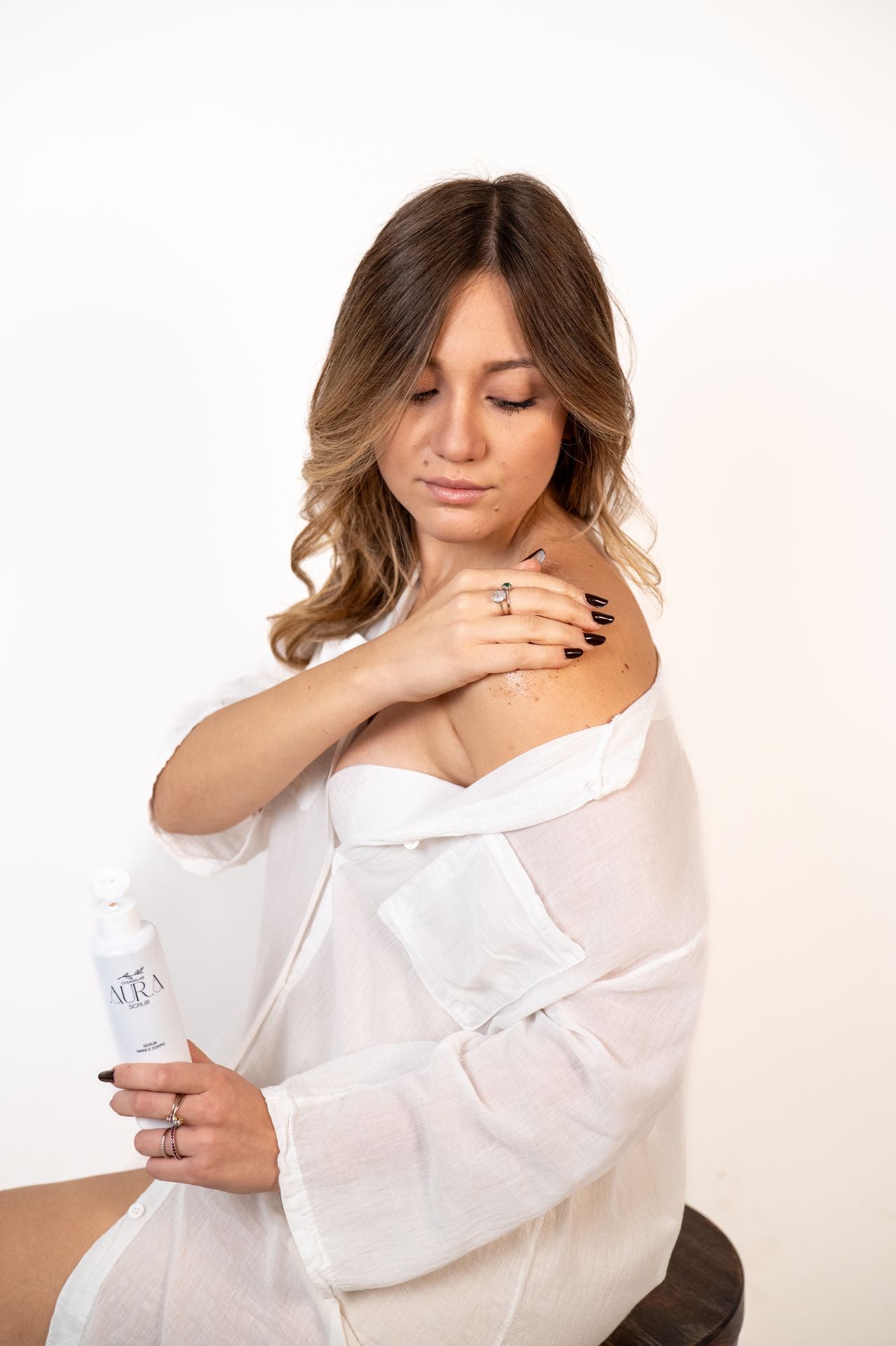 Con AURA SCRUB ogni gesto diventa un’esperienza sensoriale: una carezza che purifica, rigenera e trasforma. La sua formula unica, arricchita con microgranuli naturali di sale marino, zucchero e noccioli di frutta, agisce delicatamente per eliminare le cellule morte e le impurità, rivelando una pelle più liscia, luminosa e incredibilmente morbida.